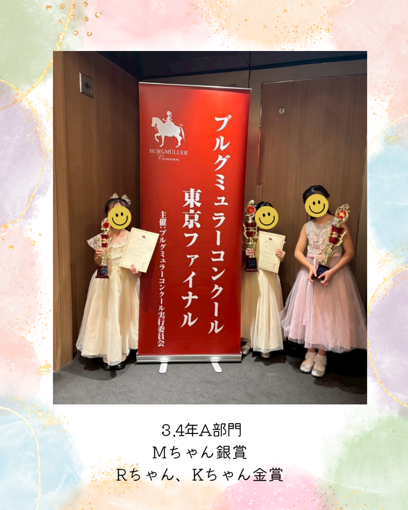 先週、12月の東京ファイナルが行われました。3.4年A部門に3名出場し、銀賞1名金賞2名と3名とも受賞することができました。3人とも、昨年の悔しい思いを乗り越えて、日々の練習を地道に積み重ねてきた成果がしっかりと表れた、素晴らしい本番でした。思うような結果に結びつかなかった生徒さんもいらっしゃいますが、挑戦の過程で曲に向き合い真剣に取り組み、どの生徒さんの成長も本当に大きかったです。皆さんの頑張りを心から誇りに思います。